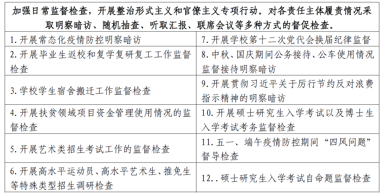 在问题线索处置、各类专项整治、党风廉政建设责任制检查中,建立合作机制,邀请校党委委员、纪委委员、重点部门负责人、新提任处职干部、纪检委员共同参与其中,强化一岗双责。加强日常监督检查,开展整治形式主义和官僚主义专项行动。对各责任主体履责情况采取明察暗访、随机抽查、听取汇报、联席会议等多种方式的督促检查。