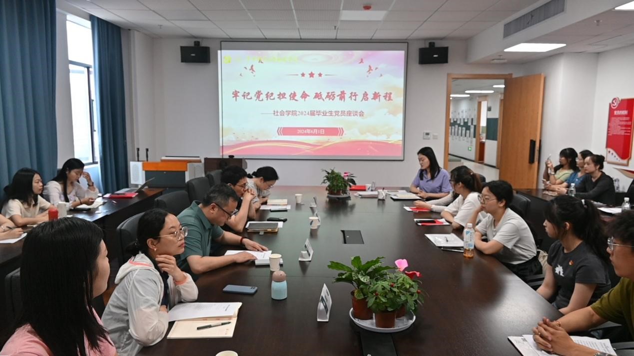 为深入贯彻习近平总书记关于党纪学习教育的重要讲话和重要指示精神,推动党纪学习教育进一步走深走实,教育引导毕业生党员立大志、明大德、成大才、担大任。6月1日,社会学院在文科科研楼(北)715党员活动室举行2024届毕业生党员“牢记党纪担使命,砥砺前行启新程”专题座谈会。社会学院党委书记冯圣兵、党委副书记王莉(线上)、党委委员吕方、毕业班班主任代表陈安娜、研究生毕业班辅导员翟娟、本科生毕业班辅导员王铭歆、党务干事向晶以及本、研毕业生党员代表参会。座谈会由本科生党支部书记郭京骁主持。